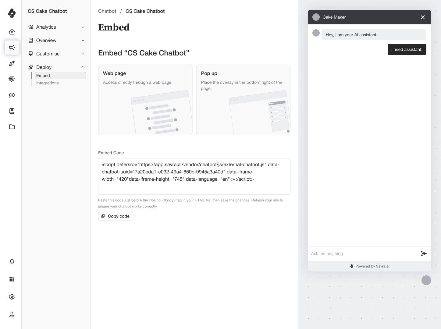 Embed your AI chatbot into any website or platform in minutes. A lightweight code snippet is all you need to launch and start engaging customers instantly.