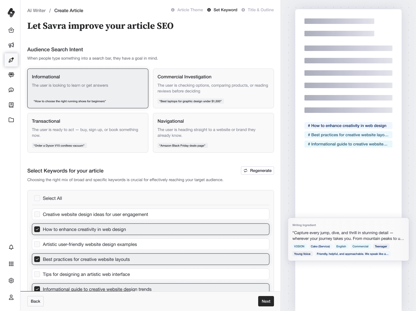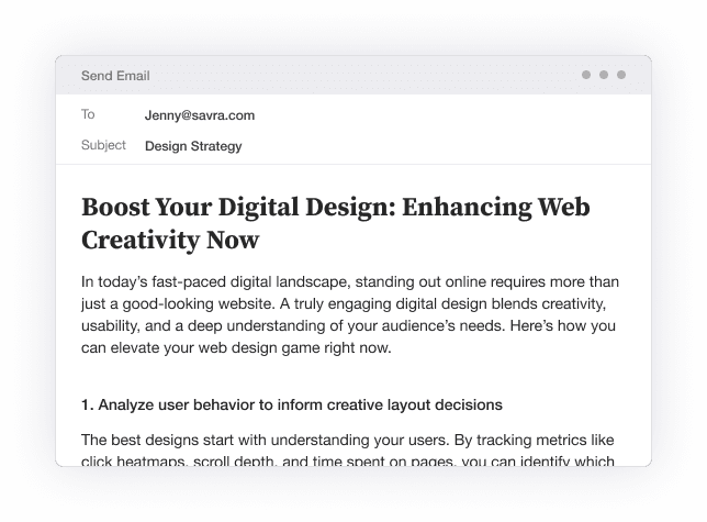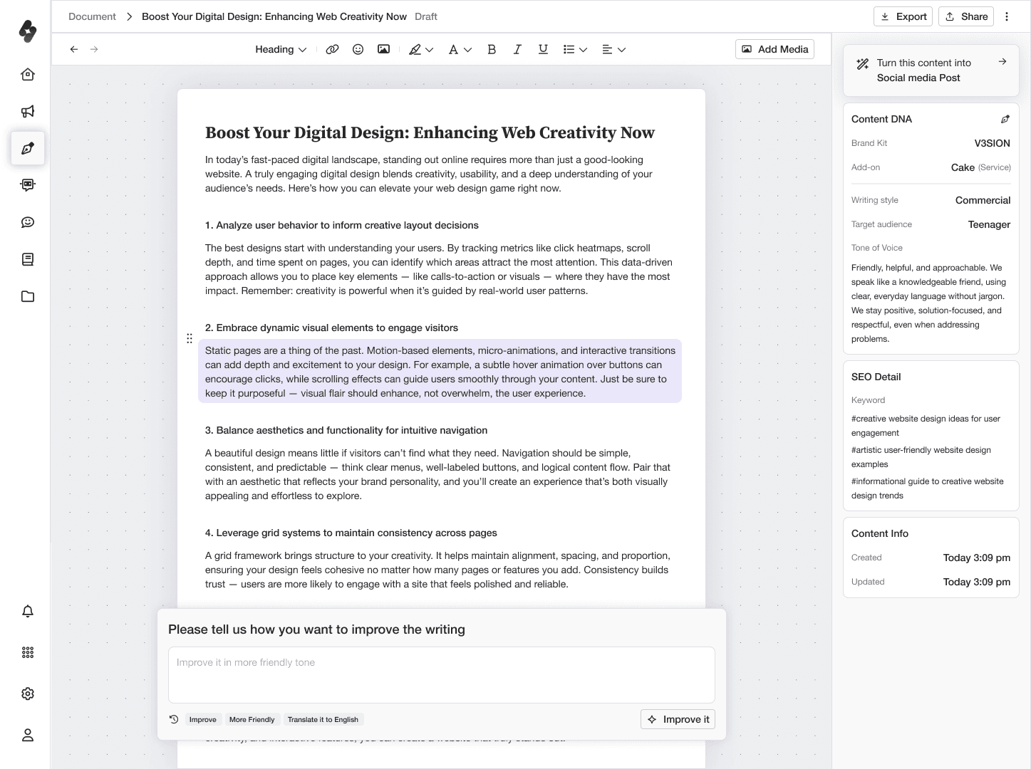 Refine your writing with AI-powered clarity, tone control, and structure suggestions. The editor helps you rewrite, shorten, expand, and polish content while keeping your brand voice consistent.